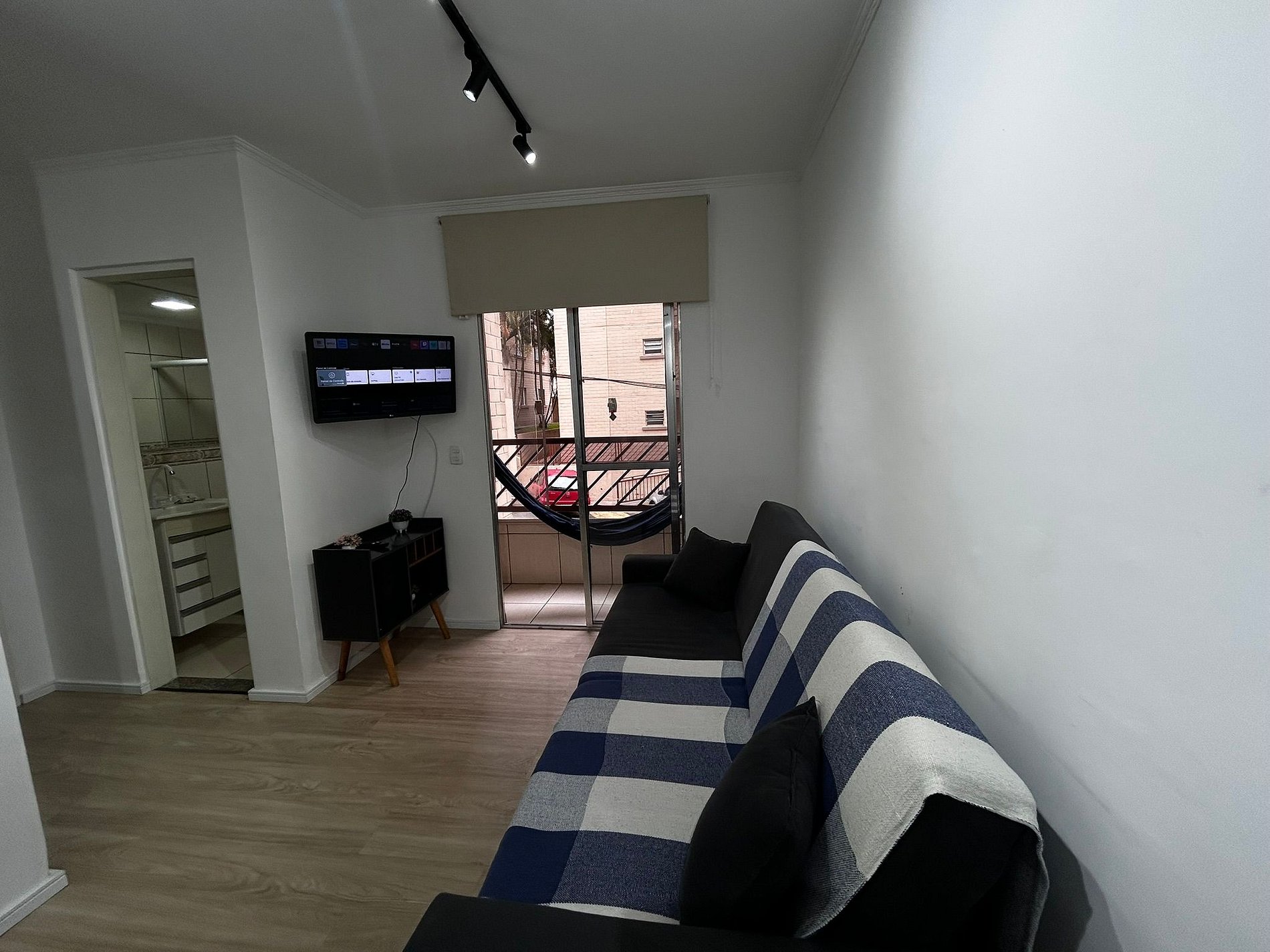 Sala de estar: equipada com um sofá-cama de casal, ideal para relaxar e acomodar mais hóspedes.